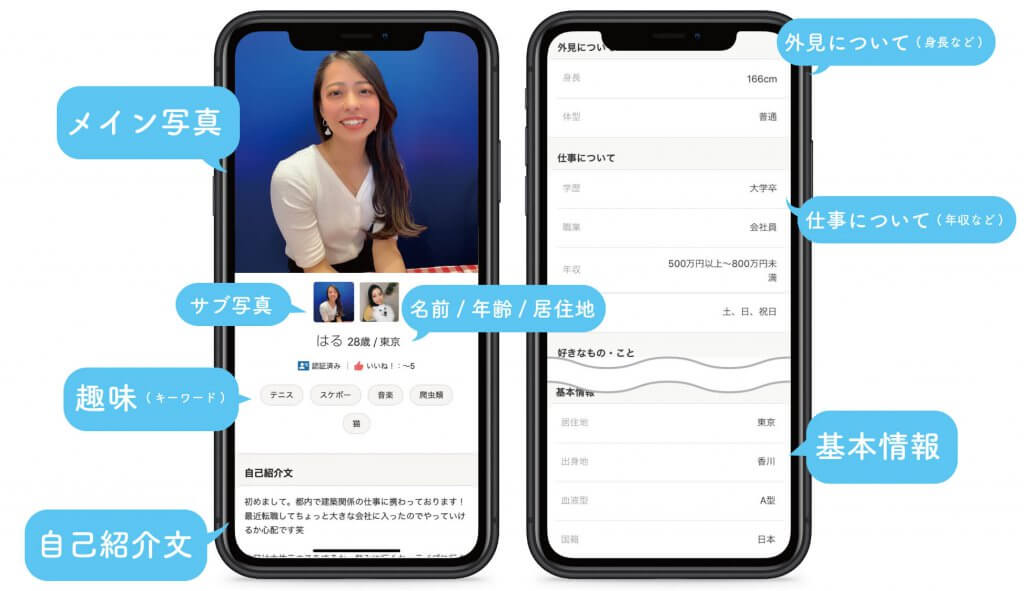 Omiaiでは相手のプロフィールを見るだけで、相手の基本的な情報から趣味まで簡単にわかります。