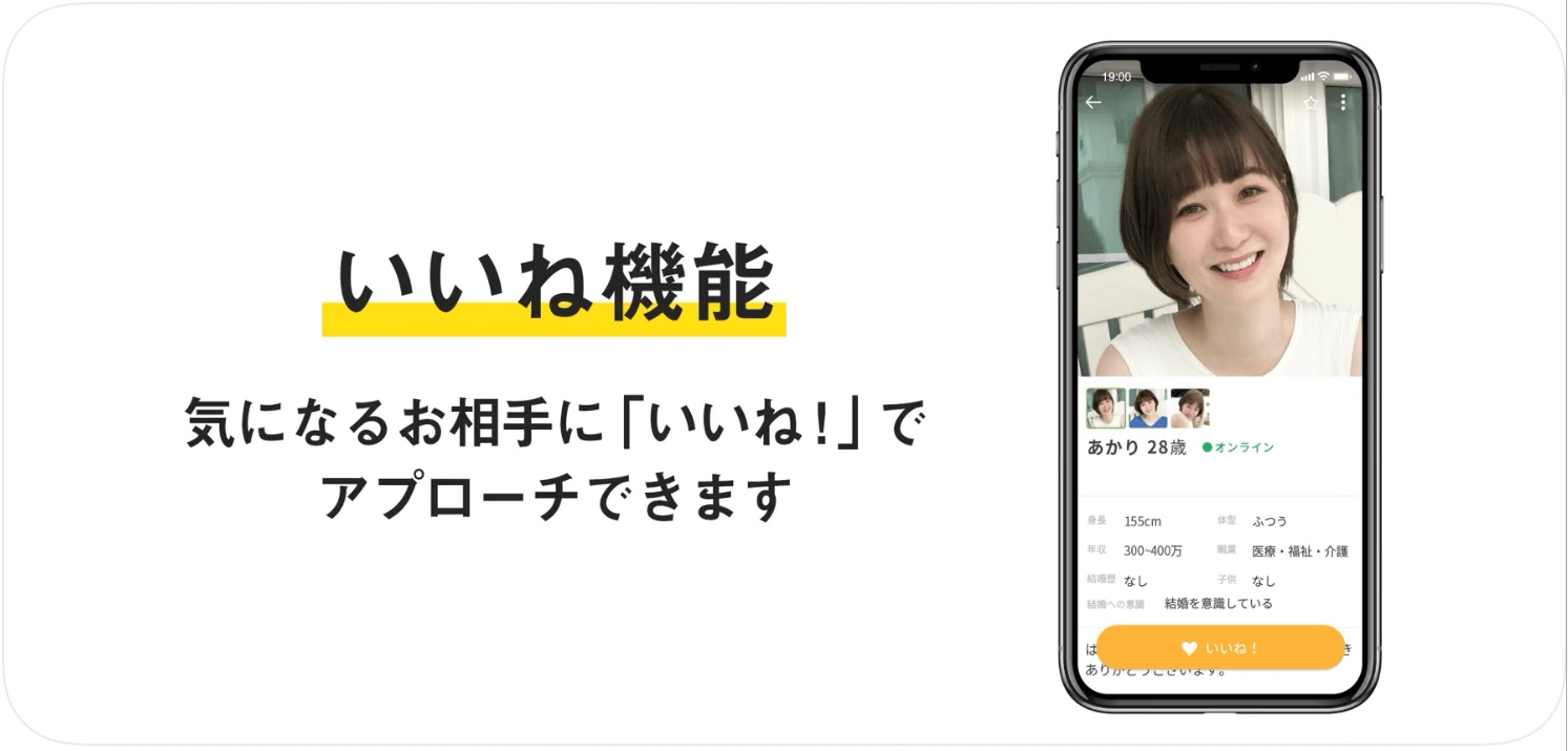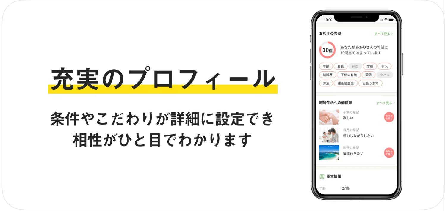 また、月々2,400円から婚活ができるお財布に優しいアプリ。プロフィール項目が豊富で、結婚後の価値観などを事前に知れるので、理想の結婚生活像がある方にはおすすめなマッチングアプリです。
