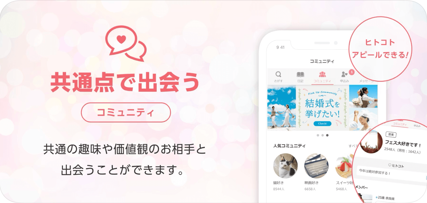 共通の趣味や価値観を持った人と繋がることができるコミュニティが充実しており、理想の相手を簡単に見つけることが出来ます。