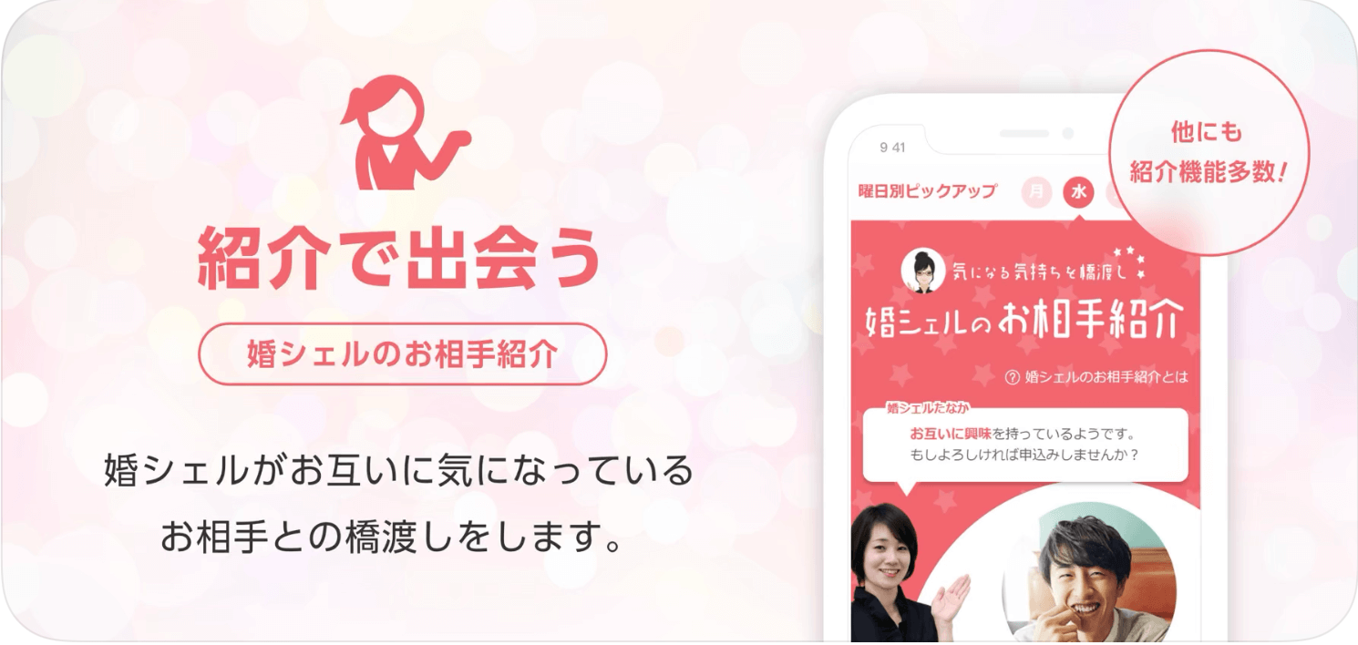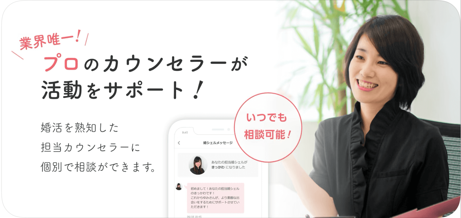 プロのカウンセラーである婚シェルのサポートを受けられる機能や共通の価値観や趣味を持った相手を探せるコミュニティ機能など効率的に婚活できる機能が盛り沢山です。